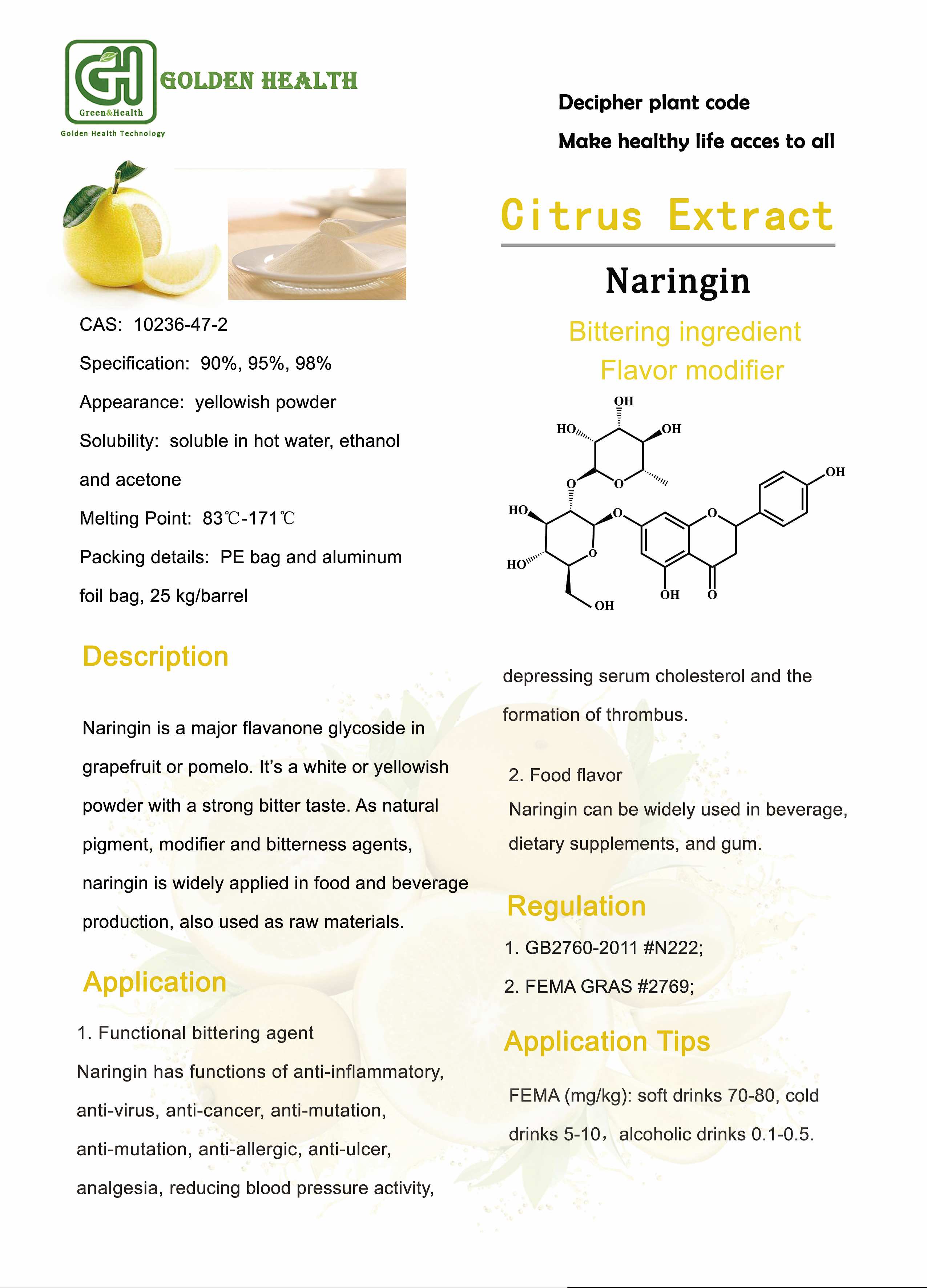 Naringin is a major flavanone glycoside in grapefruit or pomelo. It’s a white or yellowish powder with a strong bitter taste. As natural pigment, modifier and bitterness agents, naringin is widely applied in food and beverage production, also used as raw materials.