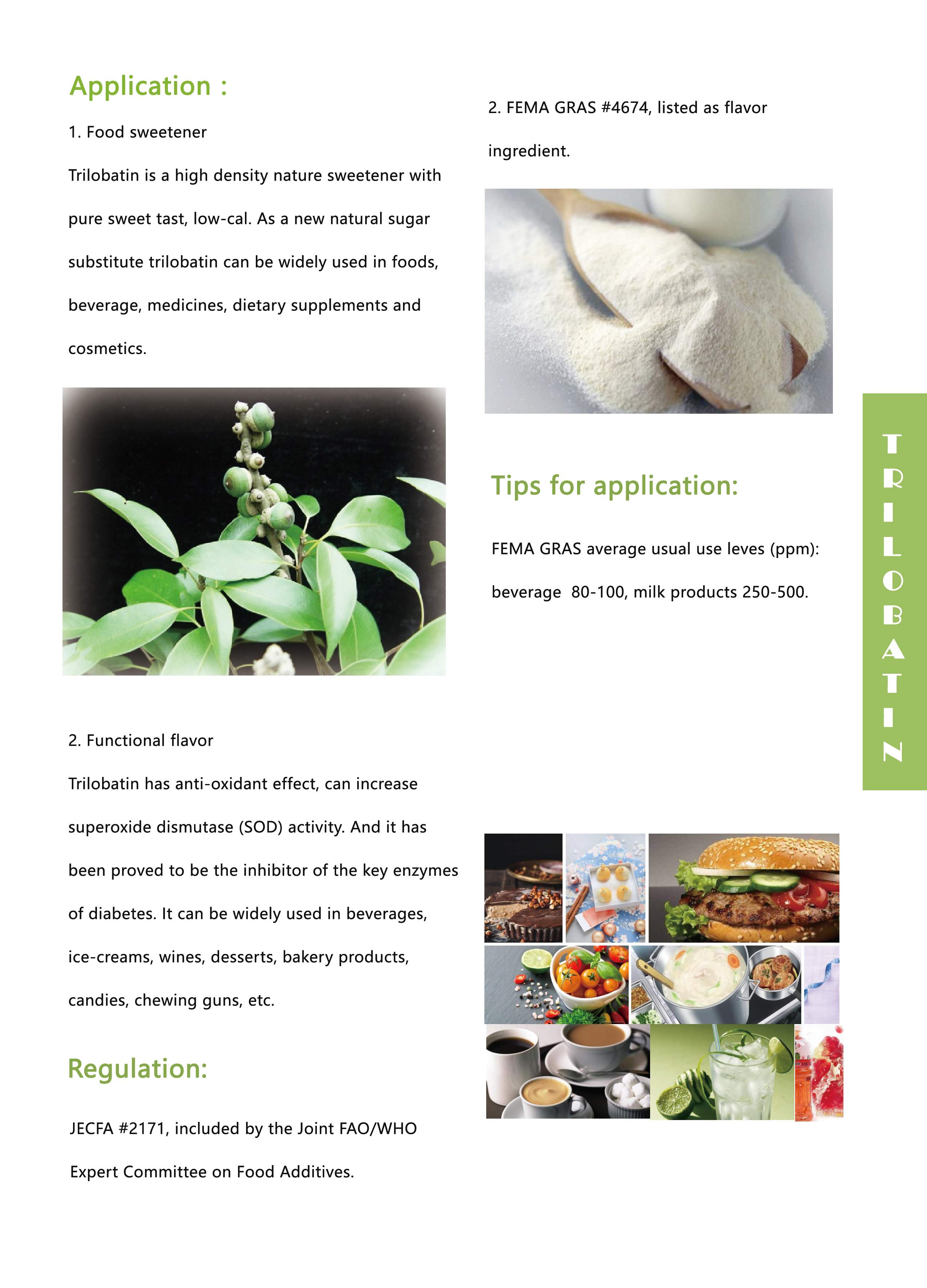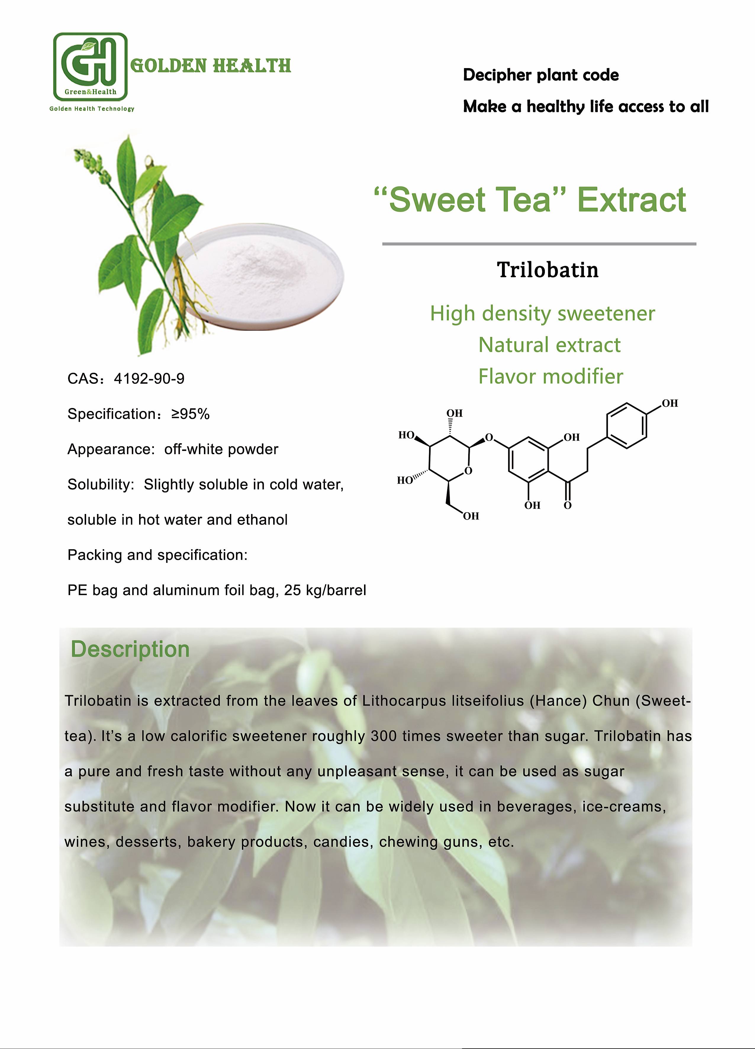 Trilobatin is extracted from the leaves of Lithocarpus litseifolius (Hance) Chun (Sweet-tea).It’s a low calorific sweetener . Trilobatin has a pure and fresh taste without any unpleasant sense, it can be used as sugar substitute and flavor modifier.